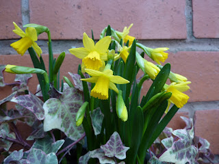 Remember that pot with the ivy and bulbs in that I thought were daffodils? Well yes they are and I remembered why I didn't remember what they were. The pot was one I bought from a local florist after easter or mothers day last year - I don't remember which - and was preplanted with the little miniature daffys. They didn't last long after I bought them which is probably why there weren't very memorable.